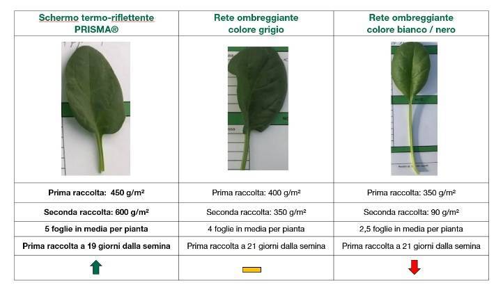 Las pruebas con las espinacas constituyen un elocuente ejemplo de la eficacia de PRISMA®. Los resultados cualitativos que asegura PRISMA® en comparación con las redes normales disponibles en el mercado no dejan lugar a la menor duda: las espinacas cultivadas bajo la malla de color gris presentaban las mejores características comerciales a nivel medio, mientras que los productos protegidos con coberturas en blanco y negro presentaban hojas alargadas, de color verde claro, y no ofrecían ninguna de las características más deseables pensando en el mercado. Las espinacas cultivadas al amparo de PRISMA®, en cambio, mostraban la forma idónea, un color verde oscuro y unas marcadas vesículas. Además, las hojas tenían tallos cortos, lo cual indica que las plantas crecen en buenas condiciones de luz.