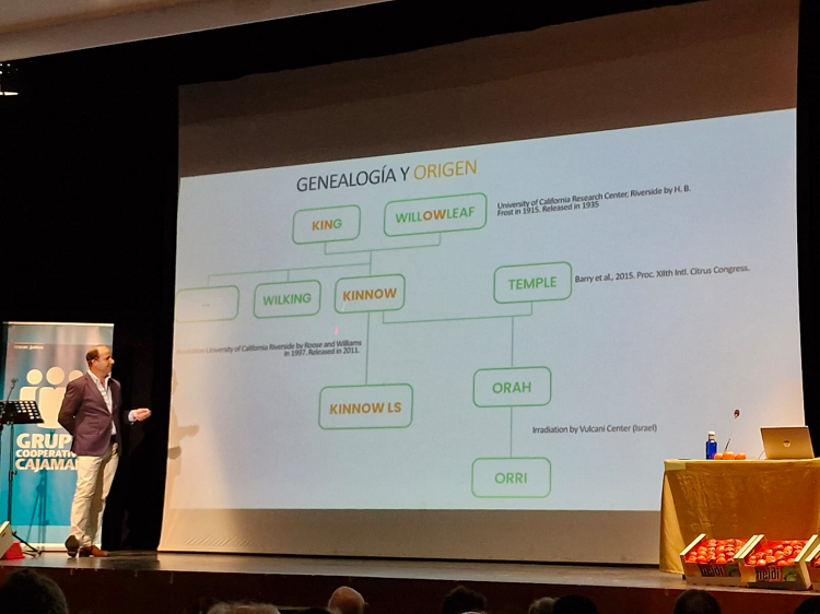 El Dr. Fontán ha dado paso a presentar la variedad KINO. Se trata de la hija de la mandarina ‘Kinnow’, una variedad que se originó en California en 1915 y fue donada a India y Pakistán en 1935, donde alcanzó una impresionante producción de más de 500 mil toneladas. Sin embargo, su crecimiento se vio limitado, y se acabó desechando, debido a que producía muchas semillas por fruto en condiciones de polinización cruzada. Para mejorar esta variedad, la Universidad de California trabajó en hacerla sin semillas, dando como resultado la ‘KinnowLS’, cuya marca es ‘KINO’.
