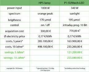 Die P1 SUNtech changes horticulture! Finally an economical LED-lighting system with a sunlike spectrum is available that can replace all HPS-lamps. The P1’s biggest advantage is it’s unique sunlight emitting LED-technology. The brand-new technology with only one LED-type enables you to benefit from it’s advantages right away – e.g. with lowering your electricity costs by 65 %.