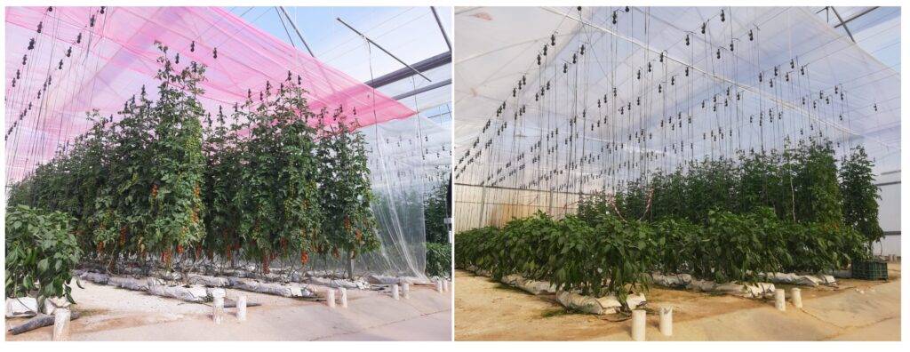 Imagen 2: Izquierda: cultivos bajo plástico con aditivo rojo – Derecha: cultivos bajo plásticos con aditivo azul
