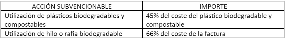 Los importes definidos en las directrices medioambientales para las acciones subvencionables de las medidas medioambientales son de un 45% del coste de los films de acolchado biodegradable en suelo (certificado según la UNE- EN 17033) y de un 66% del coste de los hilos compostables (certificados según la UNE- EN 13432):