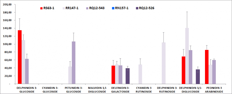 Perfil de Antocianinas identificados en papas por HPLC (mg /g. peso seco) en cinco clones de Papas cultivadas en Osorno. Los clones evaluados fueron un clon de pulpa roja (RS63-1) y cuatro clones de pulpa morada (RR147-1, RQ12-543, RN157-1 RQ12-526). El análisis de HPLC se realizó con un equipo Jasco PU-2089, UV/VIS detector e interface LC-NetII/ADC con una columna C18 Kromasil 100-5 de 150 mm, 40°C incubación, 520nm.