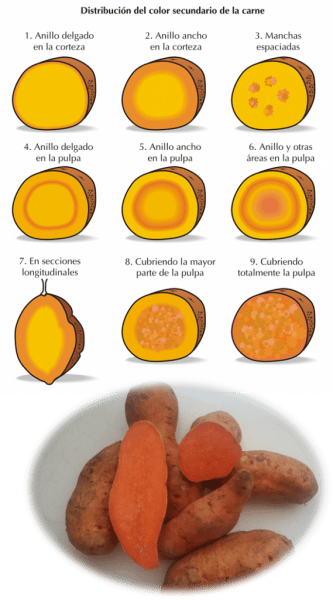 Criterios de clasificación de la raíz de camote según distribución del color de la pulpa y camote genotipo 2026N– dibujo del proyecto INNOVA 13IDL2-23323.