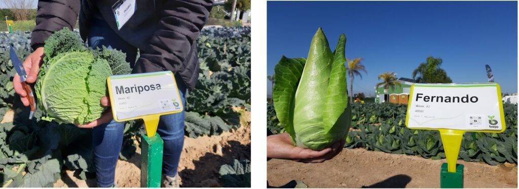 Entre las variedades de Brássicas sembradas en este campo murciano destacaron novedades como Mariposa, una col rizada muy uniforme; coles puntiagudas como Fernando, la más puntiaguda que tiene Bejo en estos momentos y que es líder por su sabor y postcosecha en exportación de ciclo medio, o Antonio, con gran permanencia en campo; o col crespa Sunbor, de color Rojo. También pudimos ver clásicos como la col blanca Benelli, de formato aplanado y de sabor muy suave y dulce, o REDI, el sprouting brócoli morado superalimento y también ganador del Innovation Hub de producto Fresco en Fruit Attraction 2020.