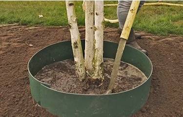 The easiest way to ensure that the water ends up in the root ball is to make a barrier around the trunk. This barrier needs to have the diameter of the root ball. It can be made of soil, but there are also plastic and biodegradable trims available.