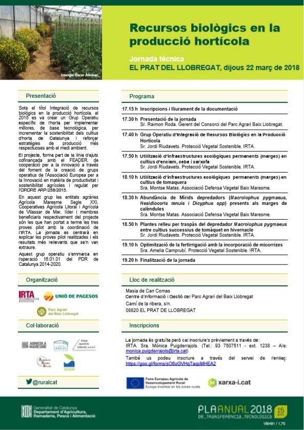 - 17.40 h Grupo Operativo de Integración de Recursos Biológicos en la Producción Hortícola, Jordi Riudavets. Protección Vegetal Sostenible. IRTA.